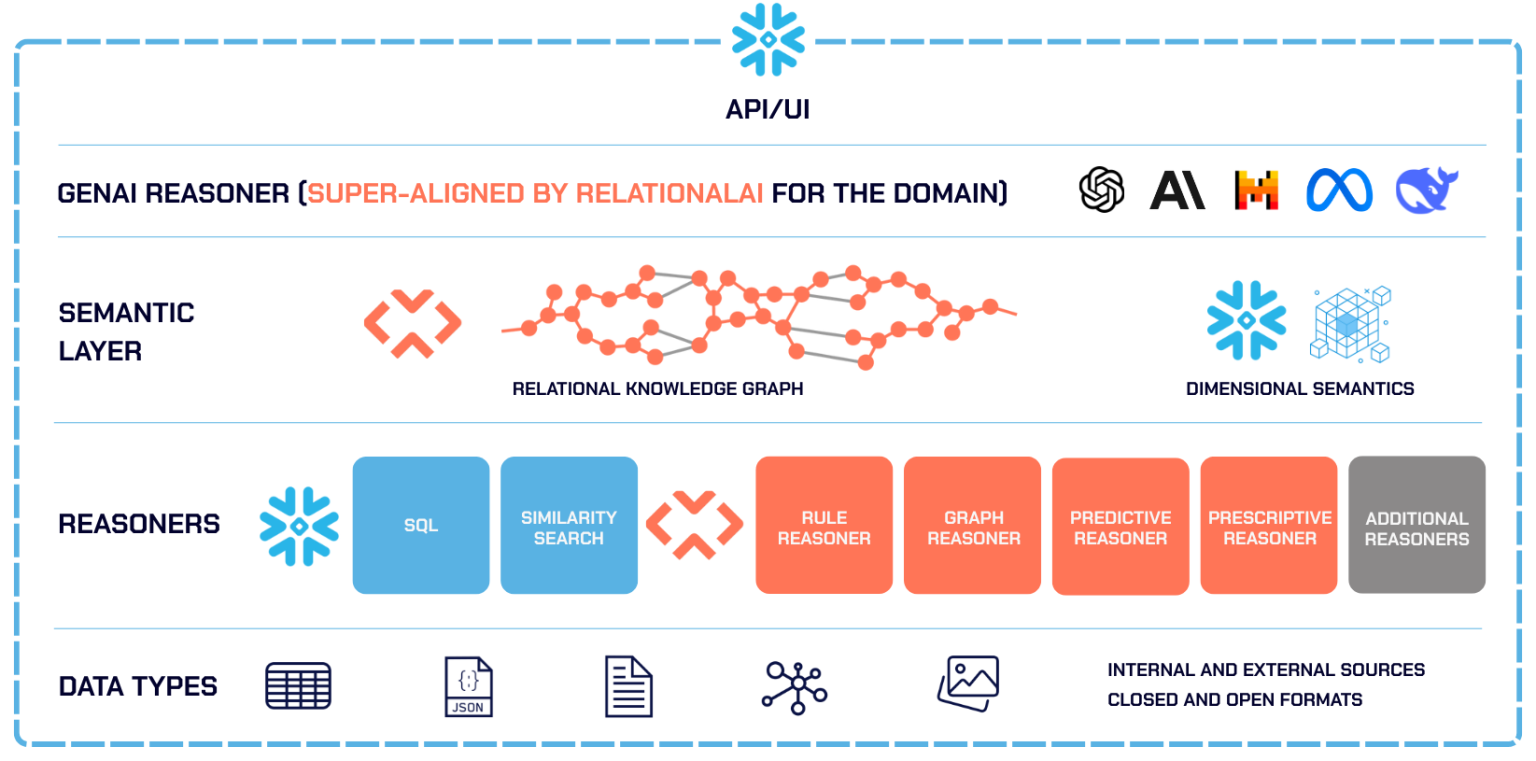 Embedded: RelationalAI runs entirely within your Snowflake account, inside your security perimeter, governed by your policies — with no need to copy or synchronize data to external tools.